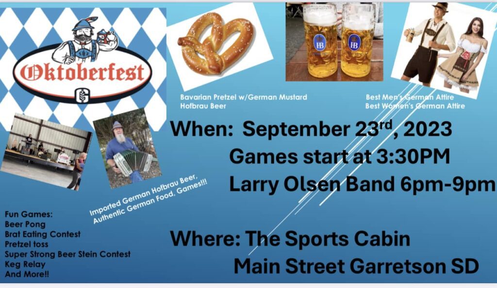 The Sports Cabin in Garretson is celebrating Oktoberfest Saturday. The bar will serve imported Hofbrau beer and serve German food. Games include a brat-eating contest, stein-holding competition, pretzel toss, key relay and more. There will be German attire contests and live music from 6 to 9 p.m.