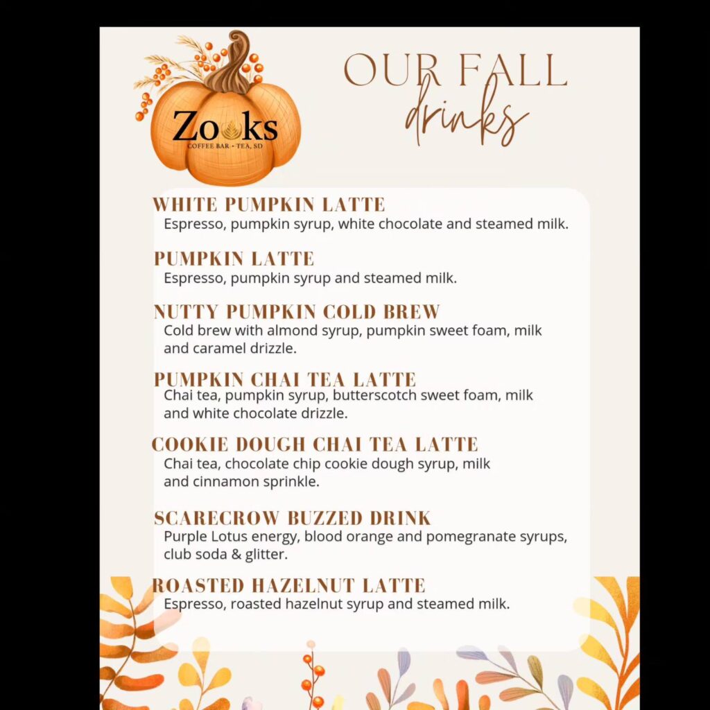Zooks Coffee Bar in Tea has added fall drinks to the menu, leaning into pumpkin flavors in several drinks but also offering a cookie dough chai tea latte and a roasted hazelnut latte.