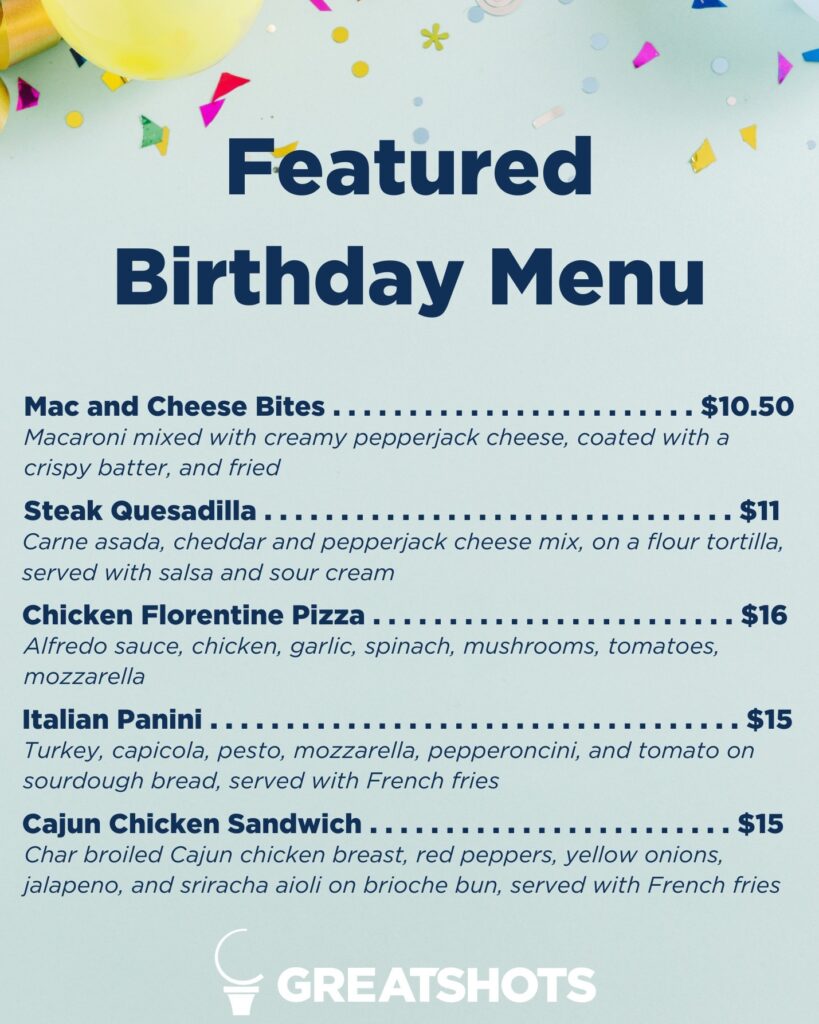 Great Shots is celebrating its third birthday through Sunday with daily specials on food, drinks and golf. Here’s a look at its featured menu. See all the specials here.