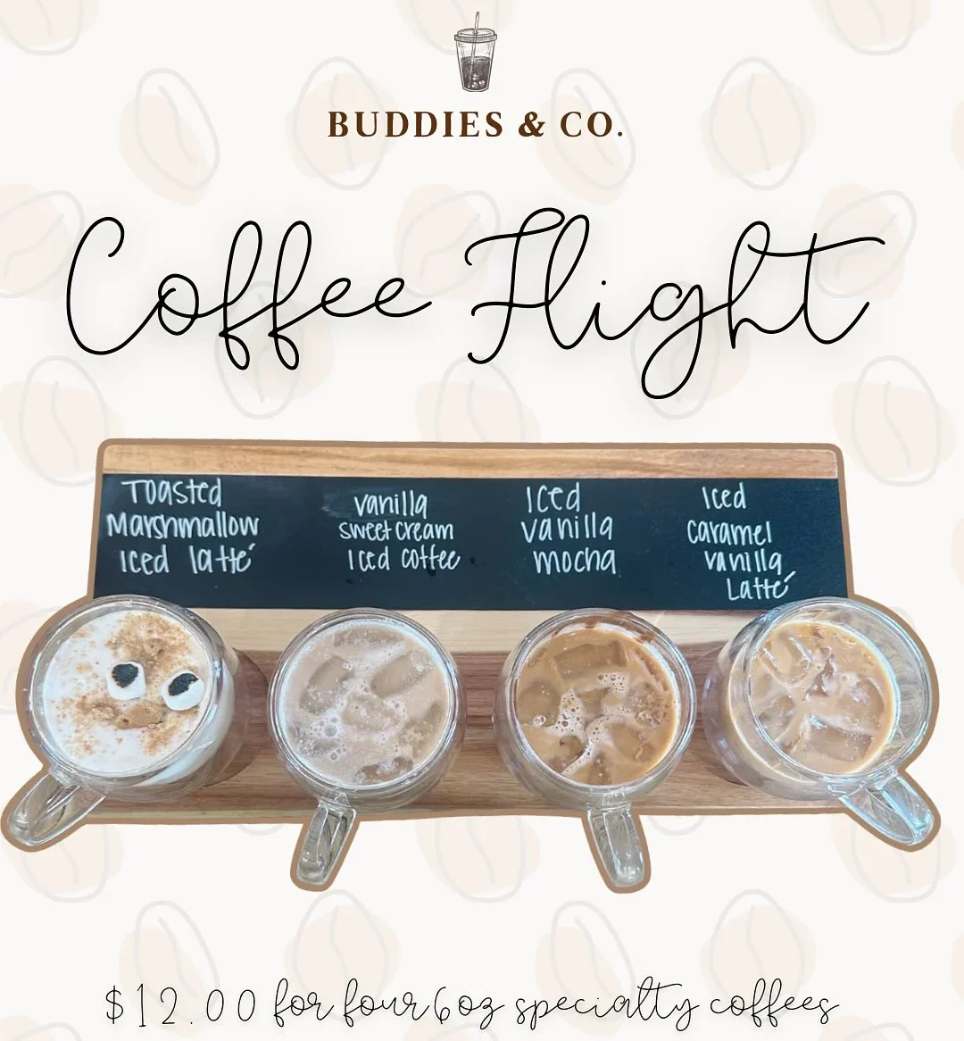 Buddies & Co. in Brandon has new coffee and lemonade flights. Get four 6-ounce specialty iced coffees or lemonades for $12. Coffee drink flavors are toasted marshmallow, vanilla, caramel vanilla and vanilla sweet cream. Lemonade flavors are strawberry tart, blueberry, Peachy-O Buzzed and huckleberry.