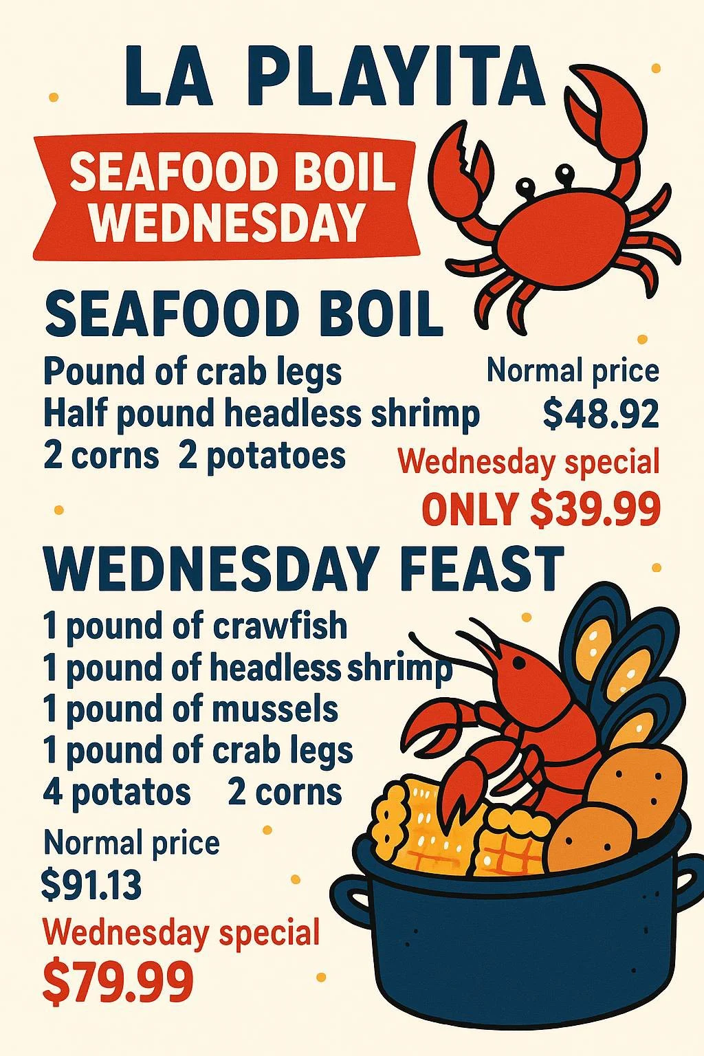 La Playita Mexican Seafood has added weekday specials. Fajita & Margarita Monday offers chicken fajitas for $15, steak for $18 and margaritas for $5. The Tasty Tuesday/Taco Tuesday special is 1 pound of crab legs, corn and potatoes for $25, and a variety of tacos for $3 each Seafood Boil Wednesday specials are shown in the photo below, and Thirsty Thursday features 32-ounce margaritas for $10, micheladas for $7, and aguachile and a bucket of beer or four micheladas for $40. Get all the details here.
