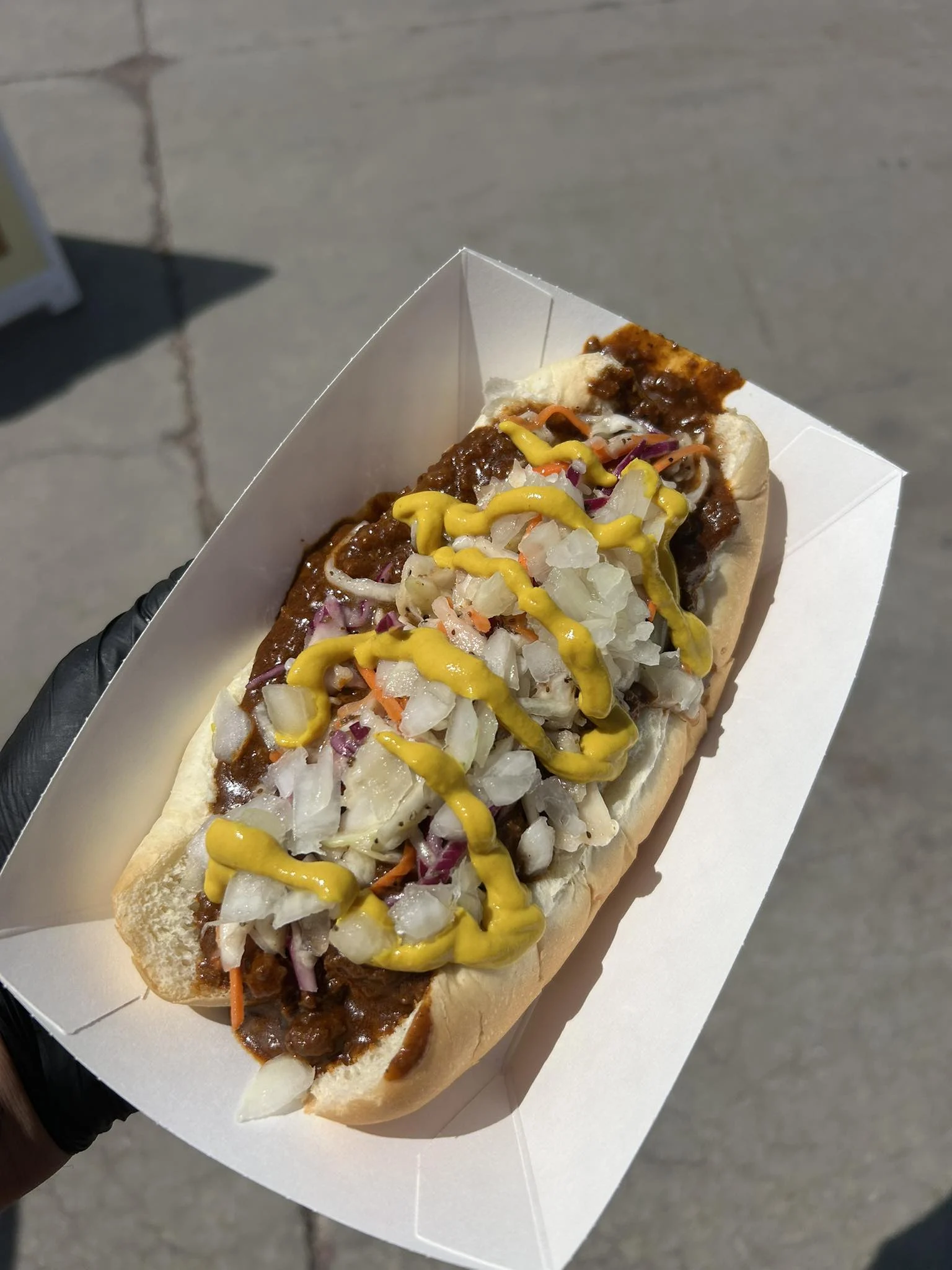The Carolina Dog is topped with chili, tangy Carolina-style coleslaw, onions and yellow mustard. Find locations for the food stand on Street Food Finder.