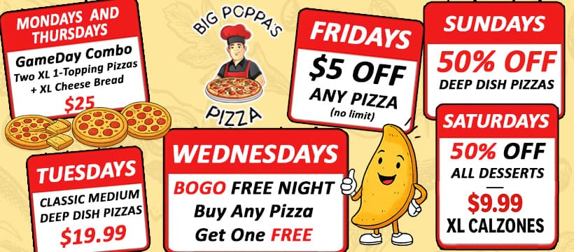 Big Poppa’s Pizza introduces new daily specials every month, and the half-price deep-dish pizzas on Sundays in November have been a big hit. The pizzeria sold out of dough last Sunday and ended up being five pizzas shy of breaking a daily record, owner Anthony Axtell said. Here’s a look at this month’s specials: