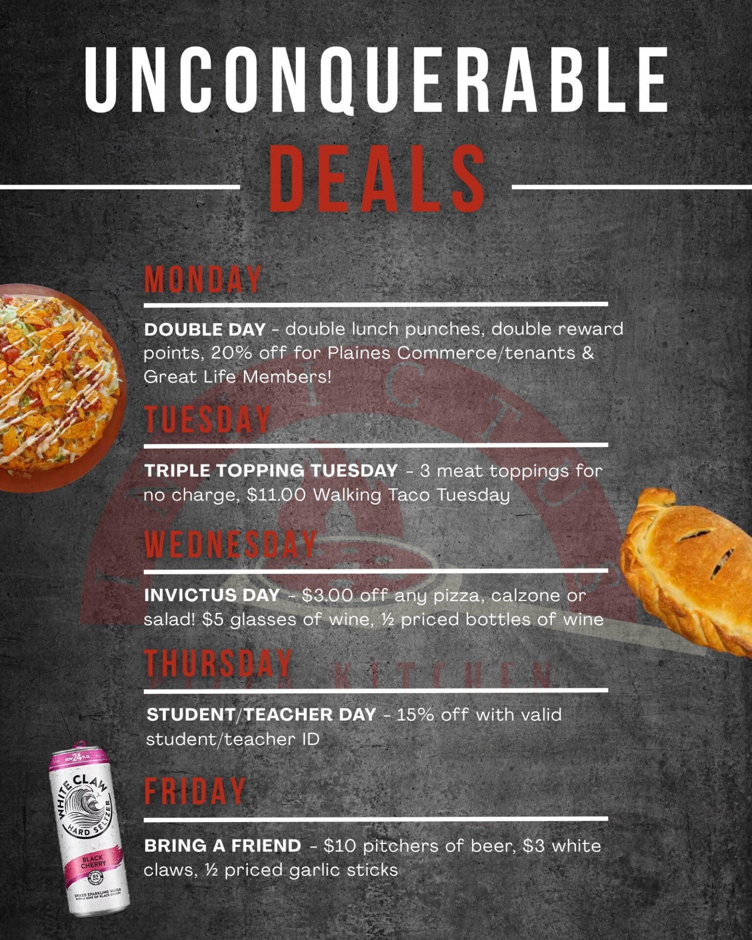 Invictus Pizza Kitchen has updated its “Unconquerable Deals” weekday offers.