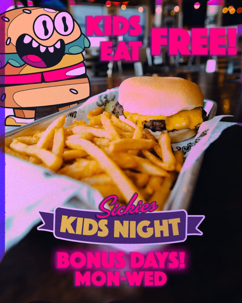 Sickies Garage Burgers & Brews has added Kids Night Bonus Days for a limited time. Two kids 12 or younger can eat for free from the kids menu with each adult meal purchased. The offer is good from 4 to 8 p.m. Monday through Wednesday.