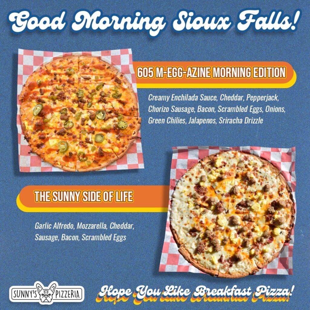Sunny’s Pizzeria, which opens daily at 11 a.m., has introduced two specialty breakfast pizzas: The 605 M-egg-azine Morning Edition and The Sunny Side of Life. The pizzeria also created Bruschetta Bites, which are baguette slices coated with garlic butter, topped with tomatoes, onions, feta crumbles, which are then baked, seasoned and drizzled with balsamic glaze.
