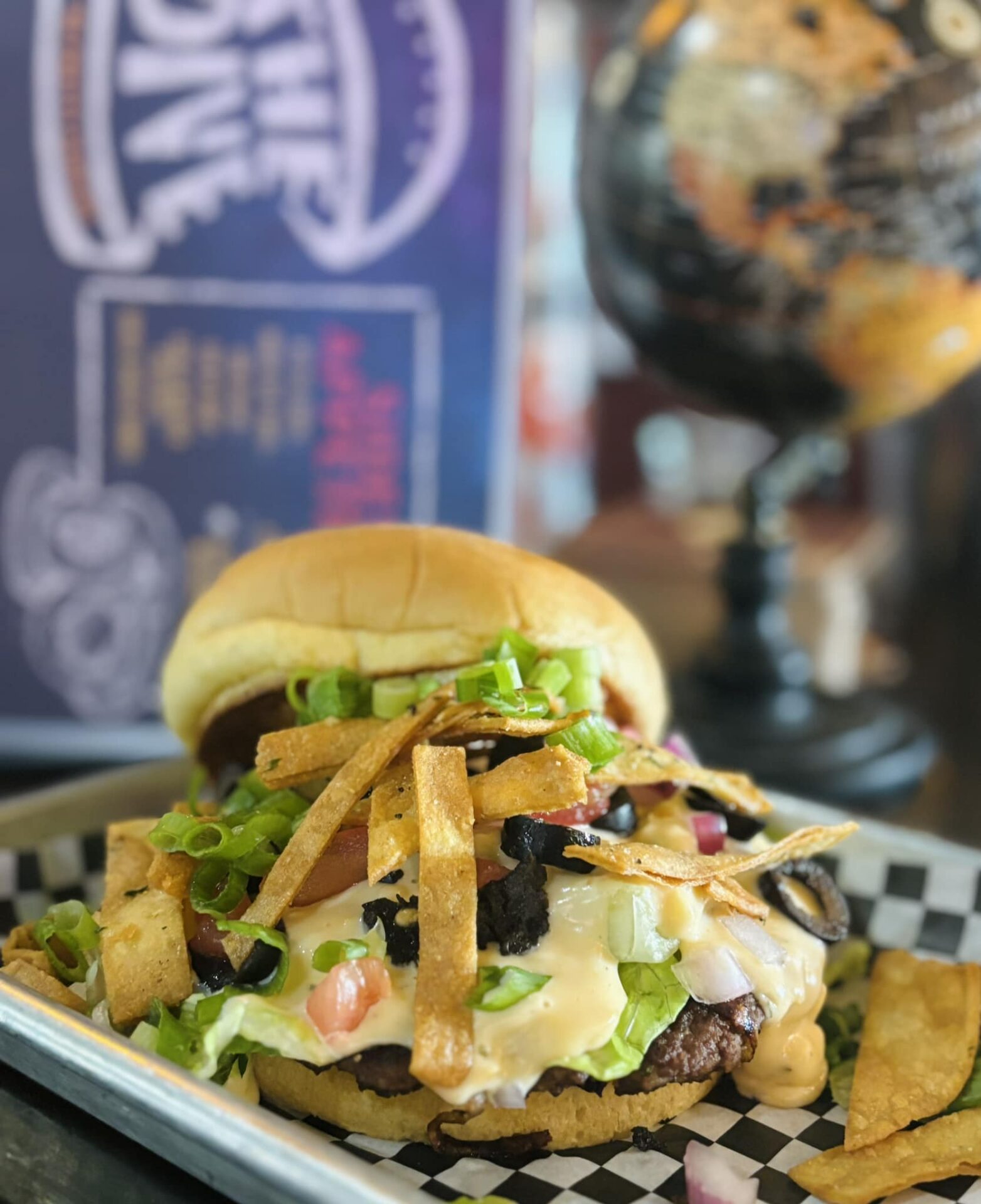 The feature of the month at The Dive is the Queso Smash Burger. The patty is smothered in house-made queso and topped with tomato, black olive, red and green onions and tortilla chips.
