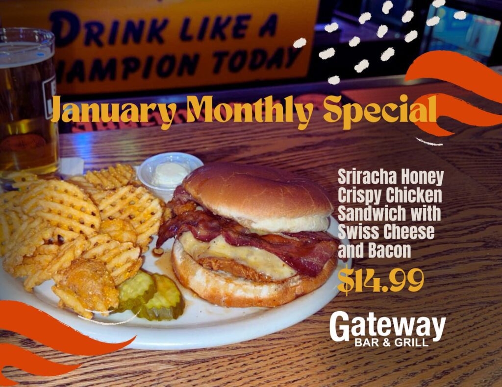 The January special at Gateway Bar & Grill is the Sriracha Honey Crispy Chicken Sandwich with Swiss cheese and bacon.
