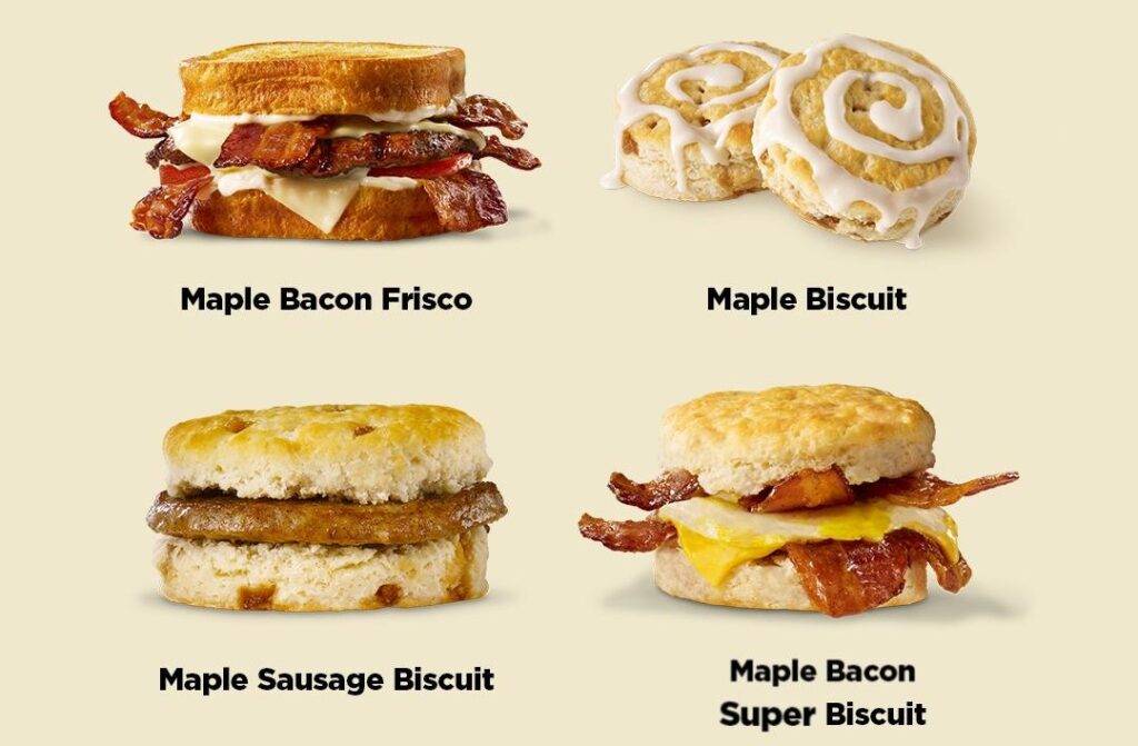 Hardee’s latest featured specials embrace the flavor of maple. Among the offerings: Maple Biscuit, Maple Sausage Biscuit, Super Maple Bacon Biscuit, Maple Bacon Frisco Burger and the Maple Bacon Snack Pack.