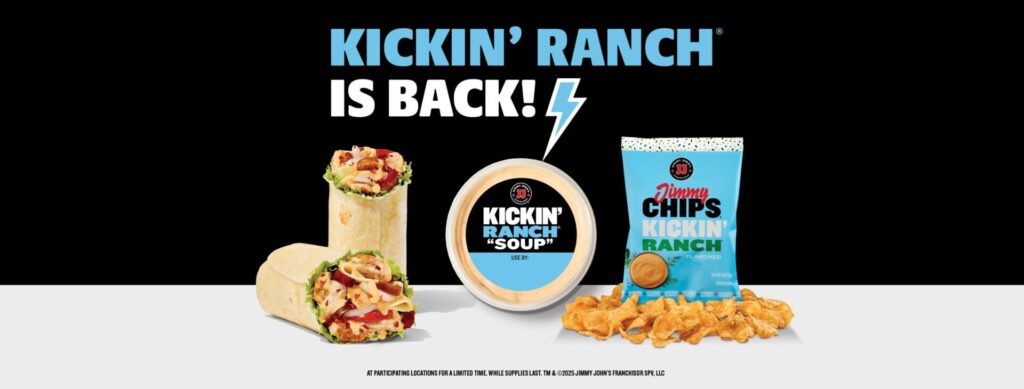 After taking Kickin’ Ranch sauce off the menu a year ago, Jimmy John’s has brought it back. It’s available as a “soup” in a 6-ounce container, on the now-permanent Kickin’ Ranch Chicken Wrap and as the flavoring for the limited-time Kickin’ Ranch Jimmy Chips. Customers can ask for it on any sandwich or wrap at no extra charge.