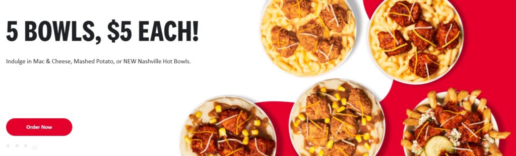 KFC is offering five bowls for $5 each: Famous Bowl and Mac & Cheese Bowl – each with regular or Nashville Hot chicken nuggets — and Nashville Hot Loaded Fries Bowl.