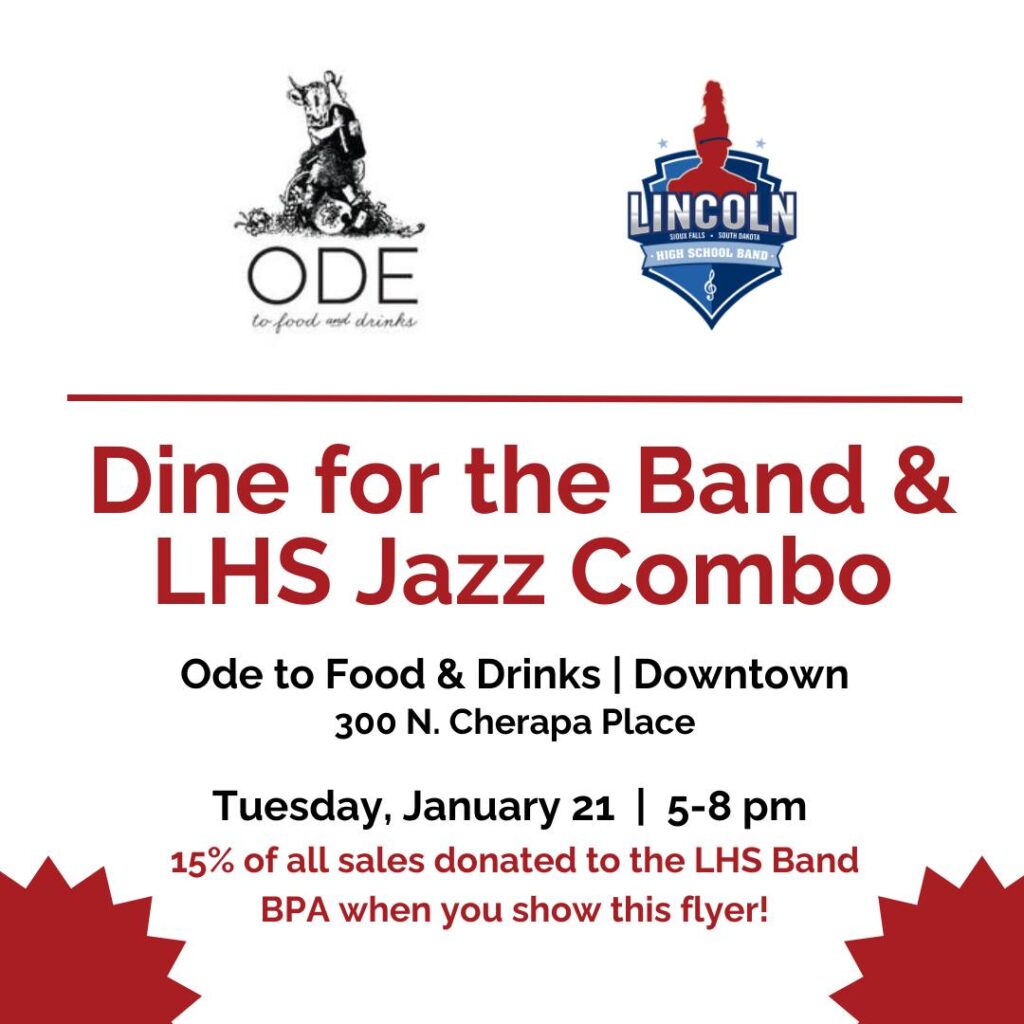 Ode to Food and Drinks is donating 15 percent of sales from 5 to 8 p.m. Tuesday to the Lincoln High School Band Parents Association when customers show the flyer below. The Lincoln Jazz Combo will be performing.