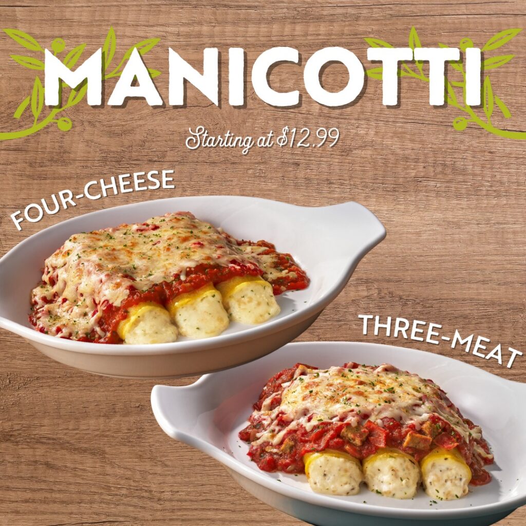 Manicotti dishes are back for a limited time at Olive Garden. Try four-cheese or three-meat offerings.