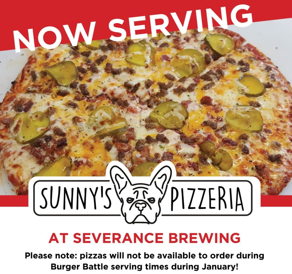 Without a kitchen of its own, Severance Brewing Co. has teamed up with Sunny’s Pizzeria to offer five pizza options. The choices are Pepperoni, Cheese, Bacon Cheeseburglar, Jalapeno Popper and Three Little Pigs Went to Severance with bacon, ham and sausage. The brewery offers suggested beer pairings with each pizza. The frozen 12-inch pies are baked on-site and range in price from $13 to $16. During January, pizza won’t be served whenever the Downtown Burger Battle offering from Rudy M. Navarrete’s Tex-Mexican Catering is available.