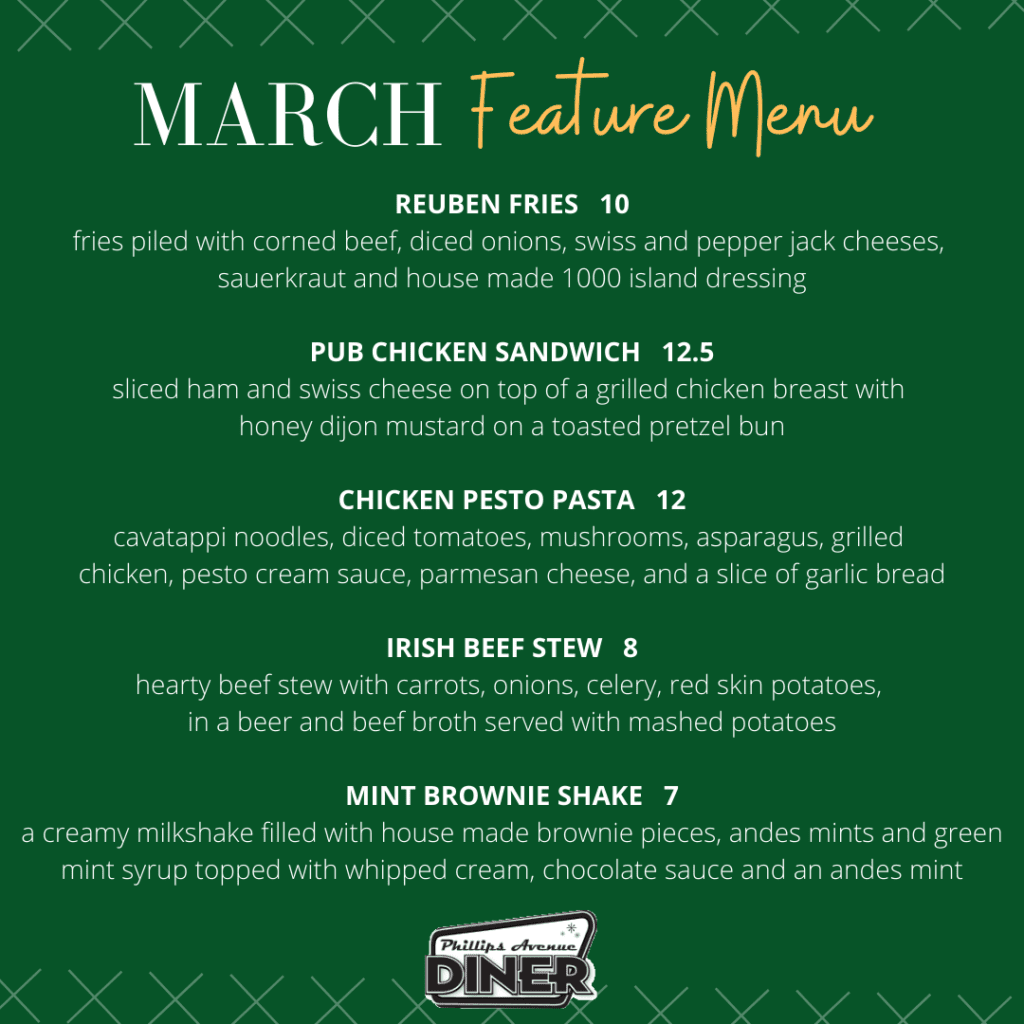 The featured menu for March at the Phillips Avenue Diner has several Irish-themed offerings. Reuben fries offer a spin on the traditional sandwich, and there’s an Irish beef stew that has red skin potatoes in it and comes with a side of mashed potatoes — because why not? There’s a pub chicken sandwich and chicken pesto pasta. The featured shake for the month is mint brownie.