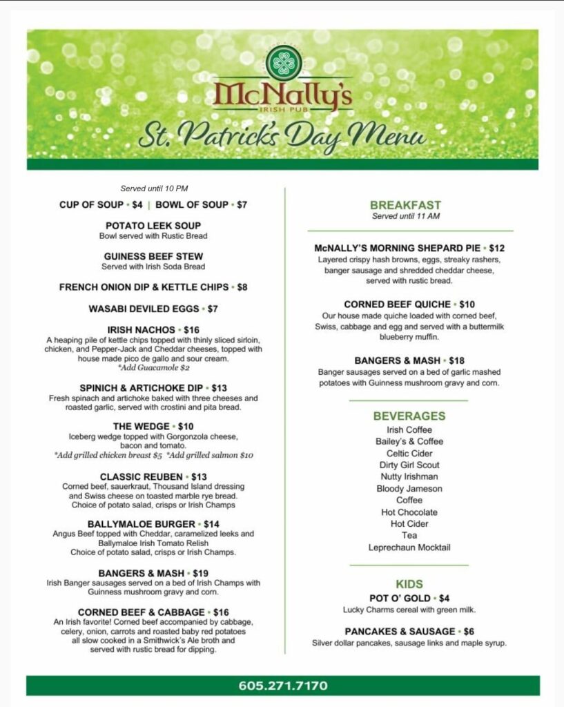 McNally’s Irish Pub has created a special menu for St. Patrick’s Day that will be available Saturday and on the feast day. There’s even a special breakfast menu with a morning shepherd’s pie, corned beef quiche, and bangers and mash. Kids can have a bowl of Lucky Charms with green milk or a plate of pancakes and sausage. The pub opens at 8 a.m. Breakfast is served until 11 a.m., and the kitchen is open until 10 p.m. If you’d rather eat at home, there are two take-and-bake options for both days: corned beef and cabbage or bangers and mash. Both family-style meals feed four to five people and come with potato leek soup, rustic bread and green beer. They need to be ordered in advance.