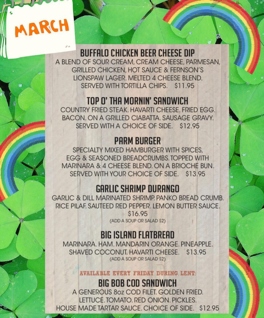 March specials at Tinner’s Public House cover a range of flavors from a spicy buffalo chicken beer cheese dip to a fresh Big Island flatbread with ham, mandarin orange, pineapple, shaved coconut, Havarti cheese and marinara. Stop in Saturday morning for green beer and corned beef hash, or come by after 11 a.m. for corned beef and cabbage.
