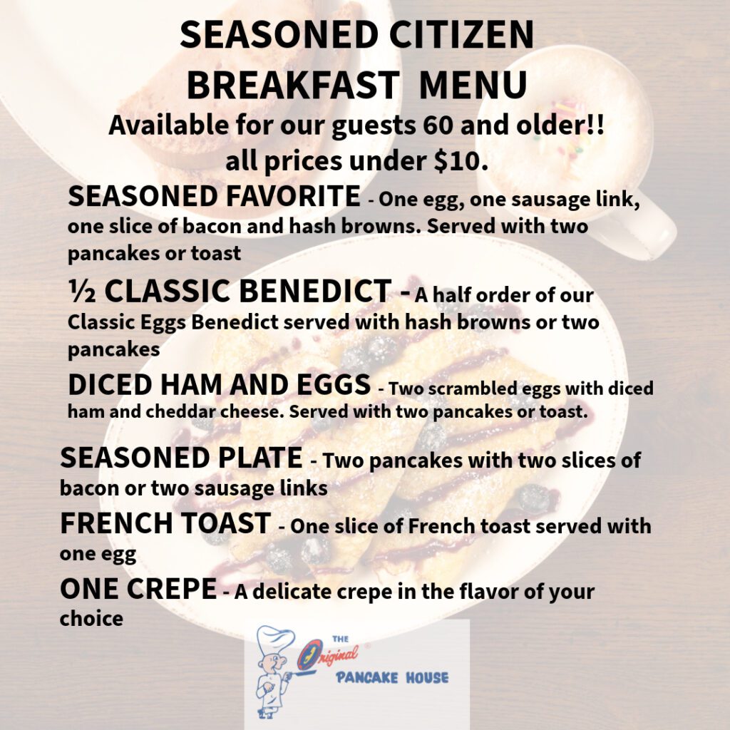 The Original Pancake House has introduced “Seasoned Citizen” menus for breakfast and lunch for those 60 and older. All items are less than $10.
