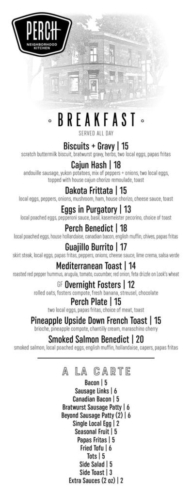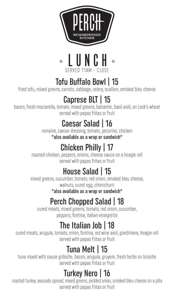 Perch has updated its menu for summer. Among the new items for breakfast, which is served all day, is Mediterranean Toast with roasted red pepper hummus, arugula, tomato, cucumber, red onion and feta on Look’s Bakehouse wheat bread. One of the new lunch options is Caprese BLT with bacon, fresh mozzarella, tomato, mixed greens, balsamic and basil aioli on Look’s wheat bread. There also will be a new salad every month.