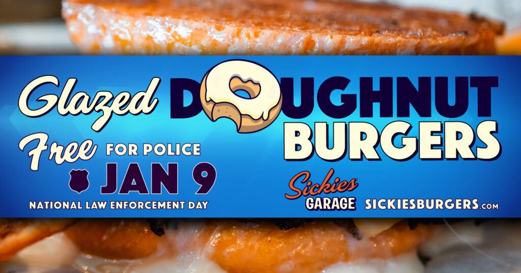 For National Law Enforcement Day on Monday, Sickies Garage is treating all officers to a free Glazed Doughnut Burger.