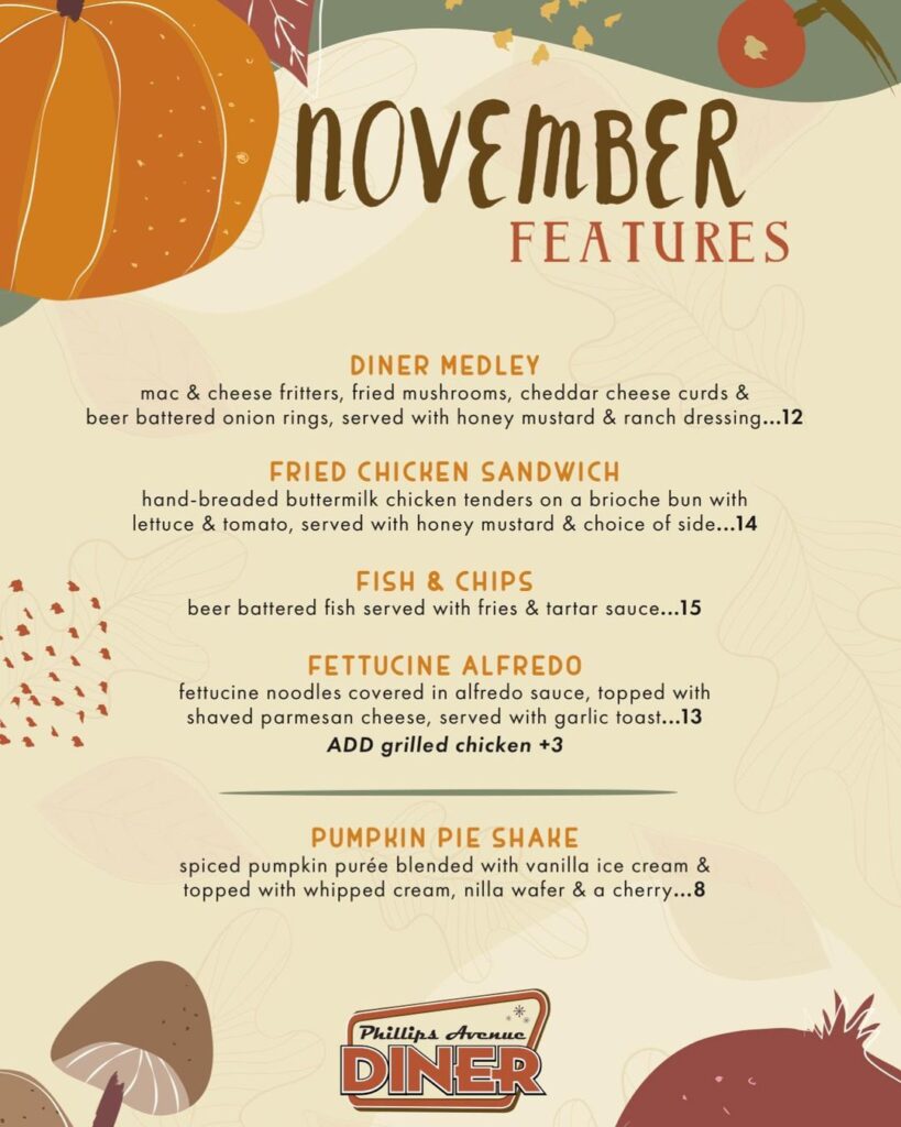 Diners picking anything from the November featured menu at the Phillips Avenue Diner will leave with a full belly. There’s a medley of fried foods, fried chicken sandwich, fish and chips, fettucine alfredo with the option of adding grilled chicken and a pumpkin pie shake.
