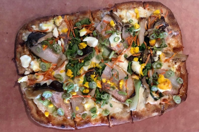 The latest featured pizza at Monks Ale House takes the ingredients for ramen and drops them on a pizza. Toppings include miso sauce, cheese, baby bok choy, local mushrooms, local hard-boiled eggs, carrots, chashu pork belly, honey sriracha sauce and scallions.