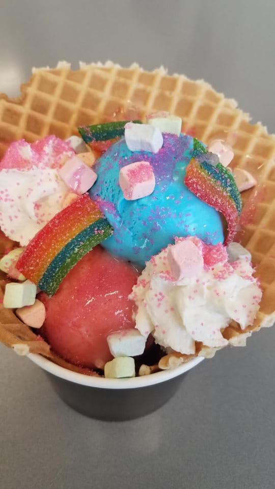 The featured sundae for the east-side location of Stensland Family Farms is a cheerful creation. Dips of strawberry sorbet and cotton candy-flavored ice cream are topped with white chocolate drizzle, marshmallow bits, sour rainbow strips, hot-pink sprinkles and whipped cream.