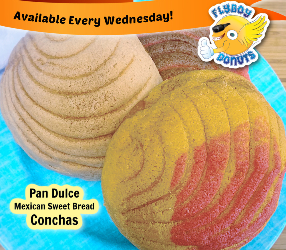 Flyboy Donuts has a new special treat on Wednesdays. The Guatemalan bakers on staff have started making conchas, a Mexican sweet bread also known as pan dulce. Find them in the case at all four locations or order online anytime for pickup or delivery that day.
