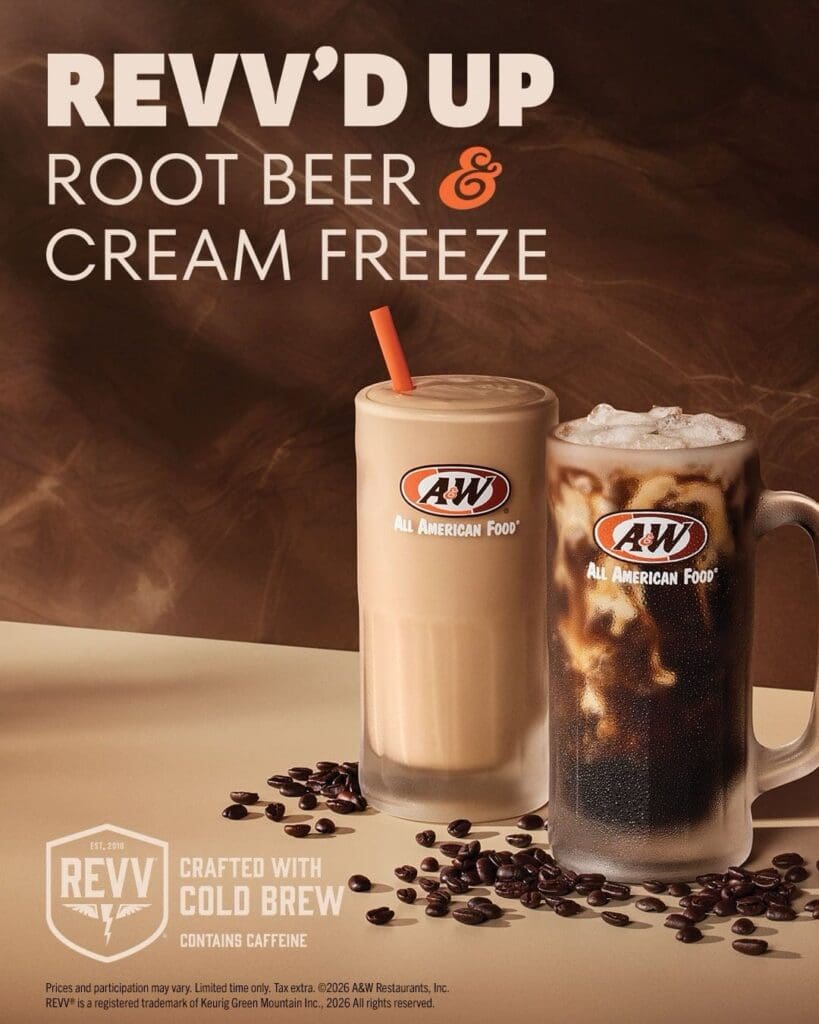 Also, for a limited time, A&W is featuring two root beer drinks with a jolt of cold brew energy. The drinks feature Revv, which is made by Keurig Green Mountain. Revv’d Up Root Beer comes with a splash of cream, and Revv’d Up Cream Freeze is blended with vanilla soft serve.