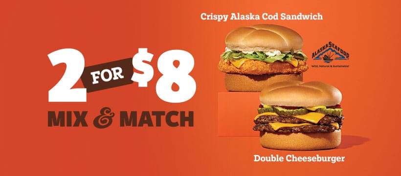 A&W has a mix-and-match, two-for-$8 special. Options are Double Cheeseburger and Crispy Alaska Fish Sandwich.