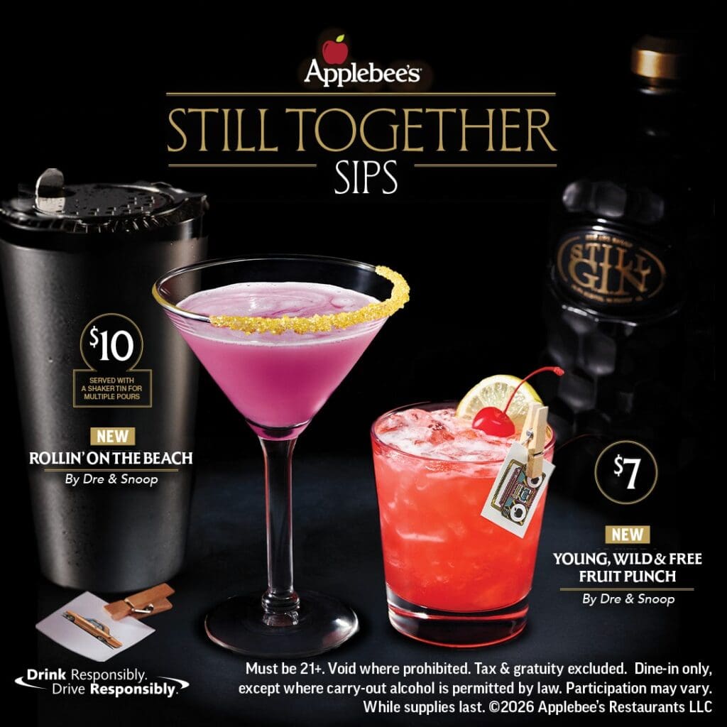 Applebee’s is featuring two new Still Together Sips. They’re made with Still G.I.N. by Dre and Snoop. Rollin’ on the Beach is $10 and Young, Wild & Free Fruit Punch is $7.