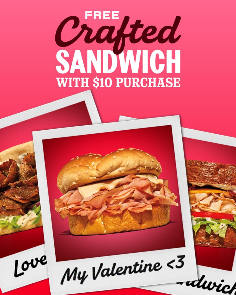 Spend $10 on an order at Arby’s through Sunday and get one of six crafted sandwiches for free.