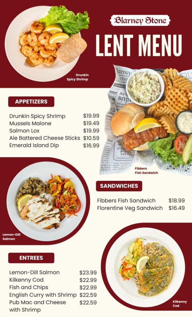 - Blarney Stone Pub has created a menu that’s available all day on Fridays. It features many of its regular seafood and meat-free dishes, along with the seasonal customer-favorite Lemon Dill Salmon.