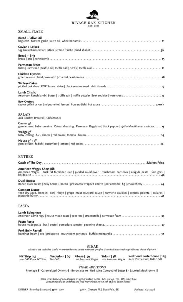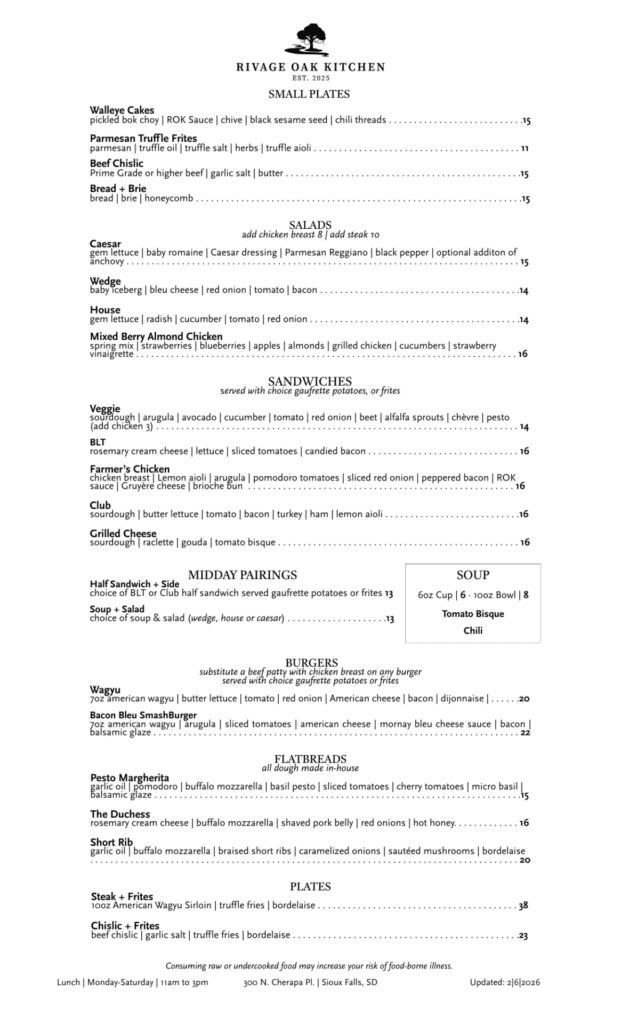 Rivage Oak Kitchen has new lunch and dinner menus. Among the new offerings at dinner are Chicken Oysters, American Wagyu Short Rib and Pork Belly Ravioli. Seasonal ingredient updates have been made to some of the other items. Some of the new lunch offerings are the Bacon Bleu SmashBurger and Mixed Berry Almond Chicken Salad.