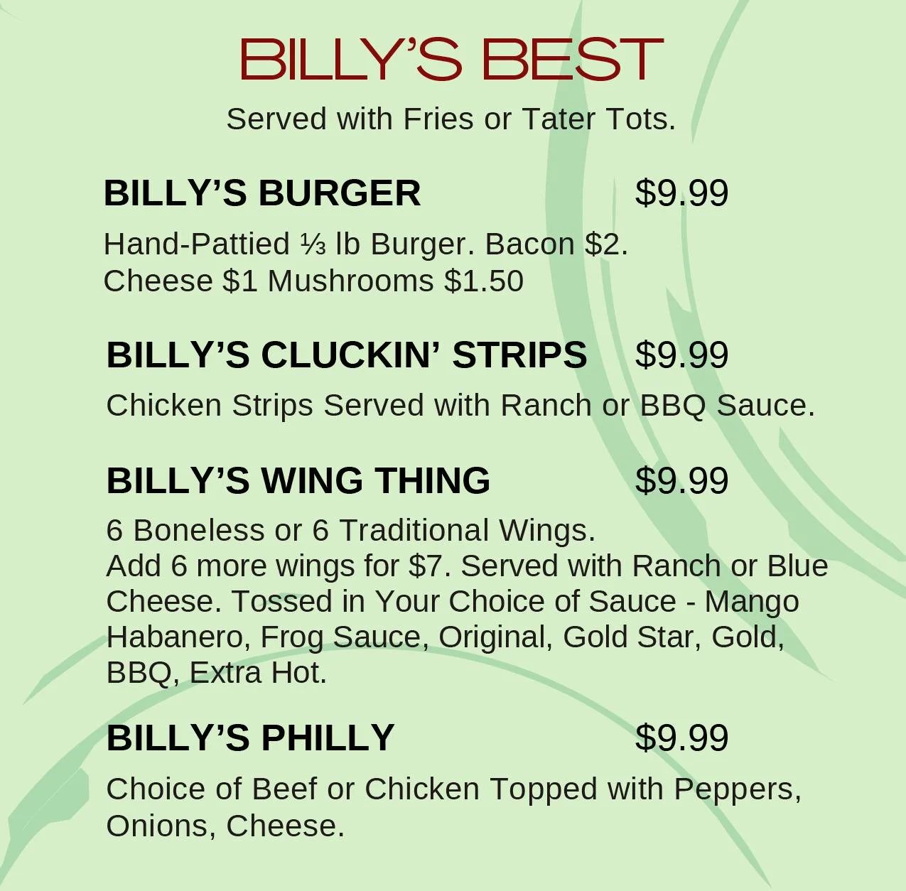 Billy Frogs Bar & Grill has new $10 Billy Baskets that are available from 11 a.m. to 10 p.m. daily. The menu also includes a dozen “Lily Pad Starters” like chislic, fried pickles and jalapeno poppers, and there are pizzas that are served until 1 a.m. See the full menu here.