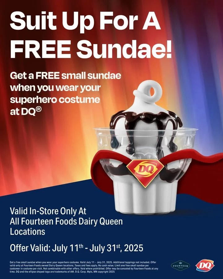 In addition, Fourteen Foods DQ locations are giving away free small sundaes to anyone wearing a superhero costume through July 31.