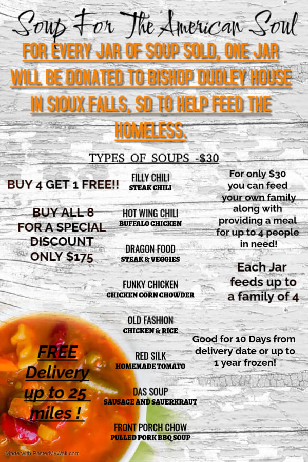 Fat Kid Filly’s is back with its annual “Soup for the American Soul” campaign to help feed guests at the Bishop Dudley Hospitality House. For every jar of soup sold, the food vendor will donate a jar to the shelter. To place an order, call or text 605-240-0615 or send a message through Facebook.