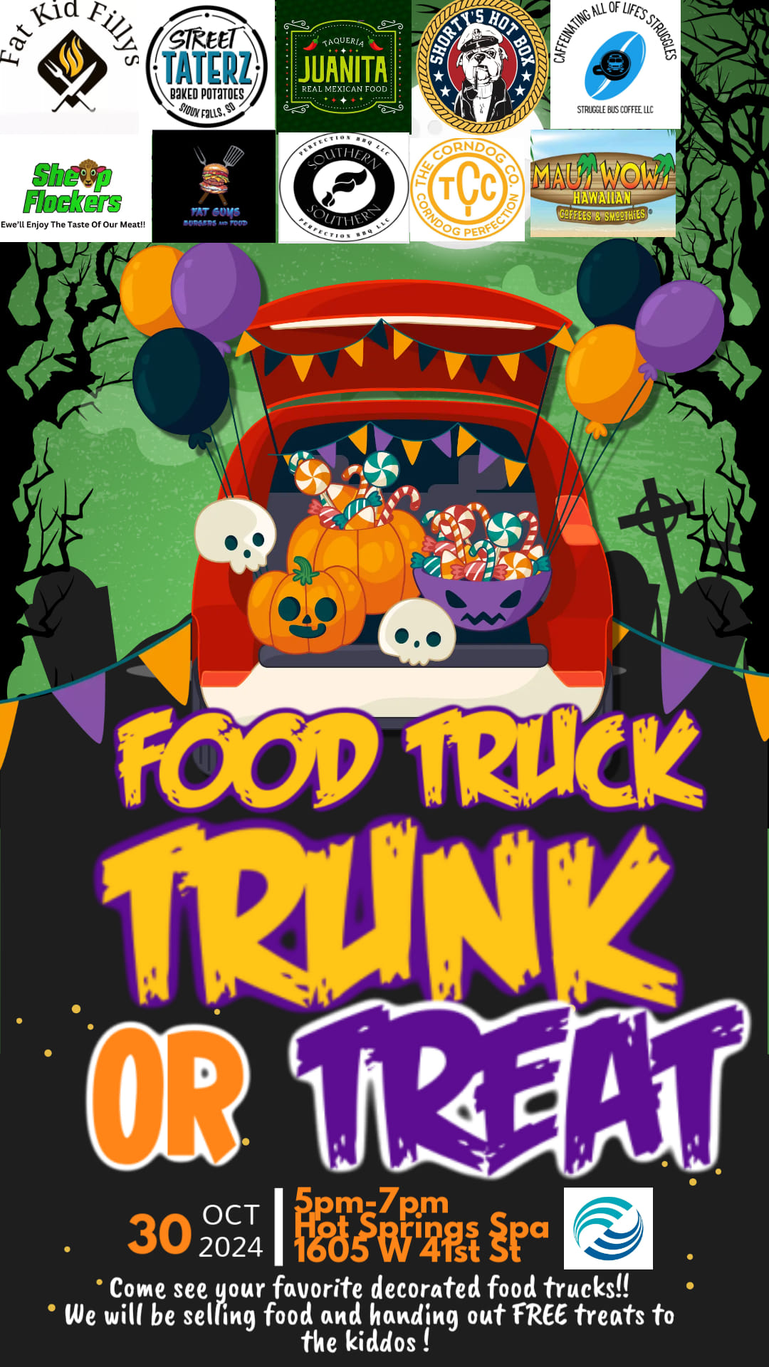 Fat Kid Filly’s is organizing a Food Truck Trunk or Treat that already has 10 food trucks lined up and room for more. It will be from 5 to 7 p.m. Oct. 30 in the parking lot at Hot Springs Spa, 1605 W. 41st St. The trucks will be decorated and will give out treats. They’ll have food and drinks for sale. Signed up so far: The Corndog Co., Fat Guys Burgers & Food, Fat Kid Filly’s, Maui Wowi Hawaiian Coffee & Smoothies, Sheep Flockers, Shorty’s Hot Box, Southern Perfection BBQ, Street Taterz, Struggle Bus Coffee and Taqueria Juanita.