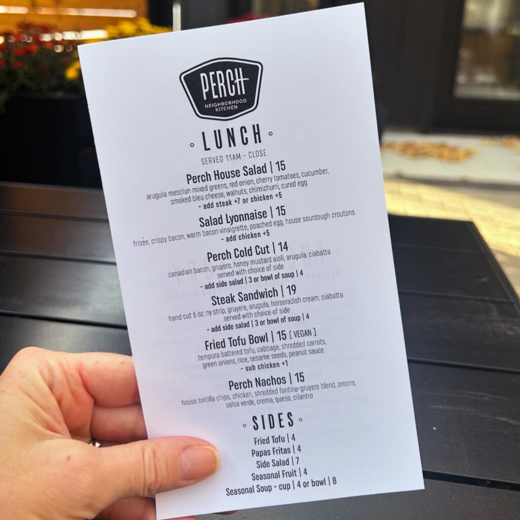 Perch has added its long-awaited lunch menu. The restaurant at Ninth and Grange has been serving breakfast only since it opened in June. Lunch is available beginning at 11 a.m. daily. The breakfast menu is served all day.