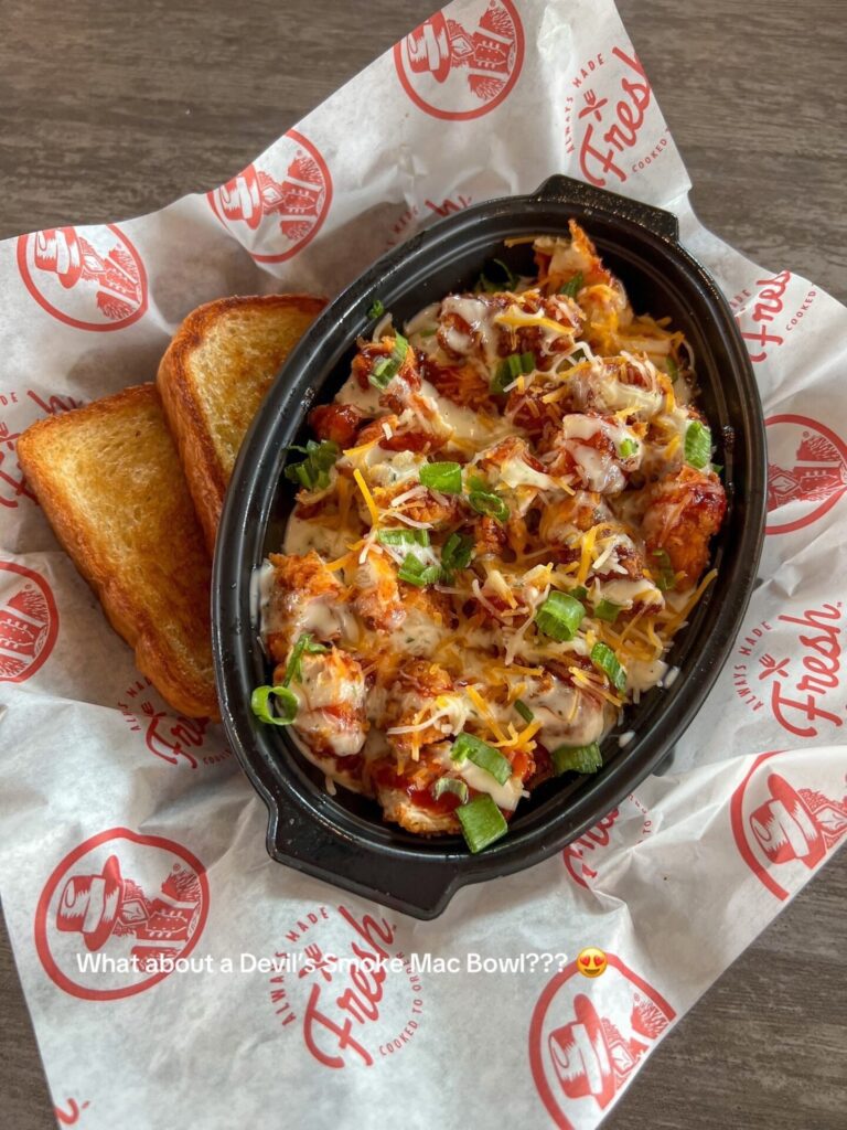 Devil’s Smoke Sauce is back for a limited time at Slim Chickens. The hot honey barbecue has a kick of crushed habanero. It’s available as a dipping sauce, on shaken wings or as part of the new Devil’s Smoke Sauce Mac Bowl.