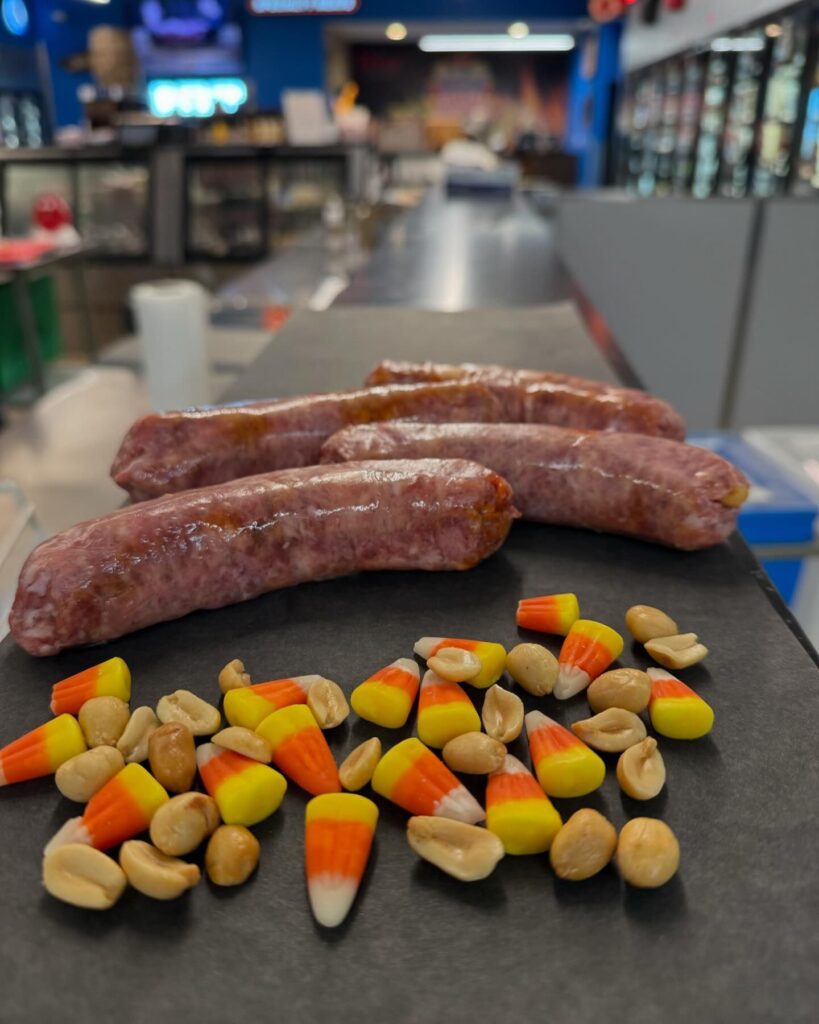 Here’s an interesting combination. Uncle Ed’s Specialty Meats has made Boo Brats that are loaded with candy corn and peanuts. They’re available through Halloween.