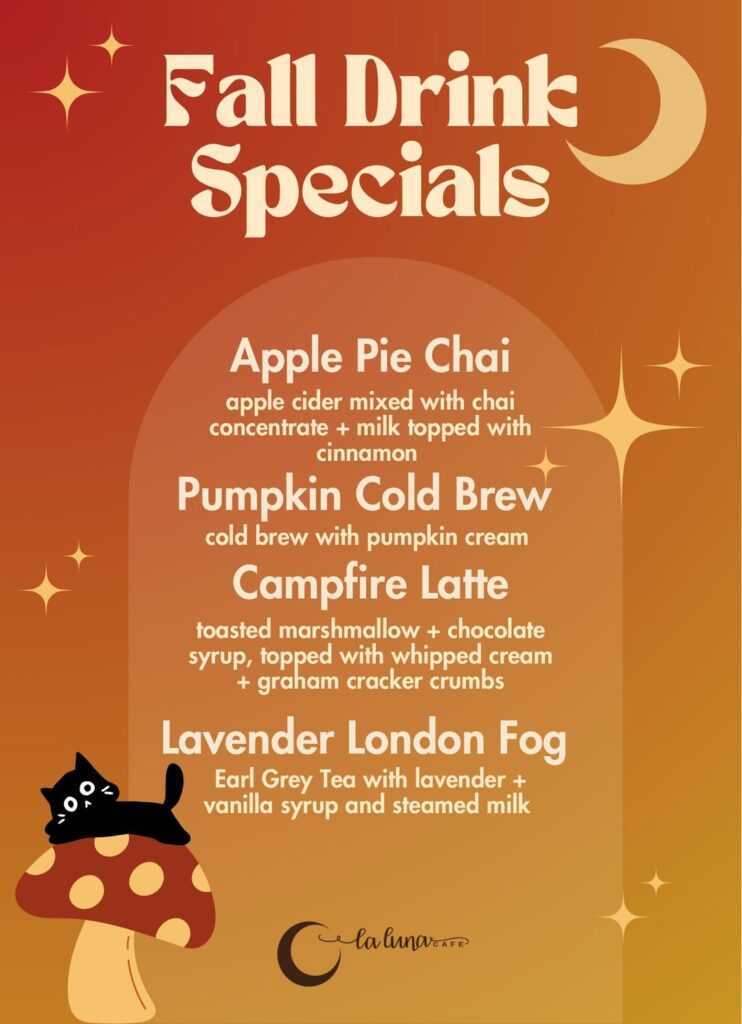 La Luna Cafe has introduced its fall menu. The featured drinks are apple pie chai, pumpkin cold brew, Campfire Latte and lavender London Fog.