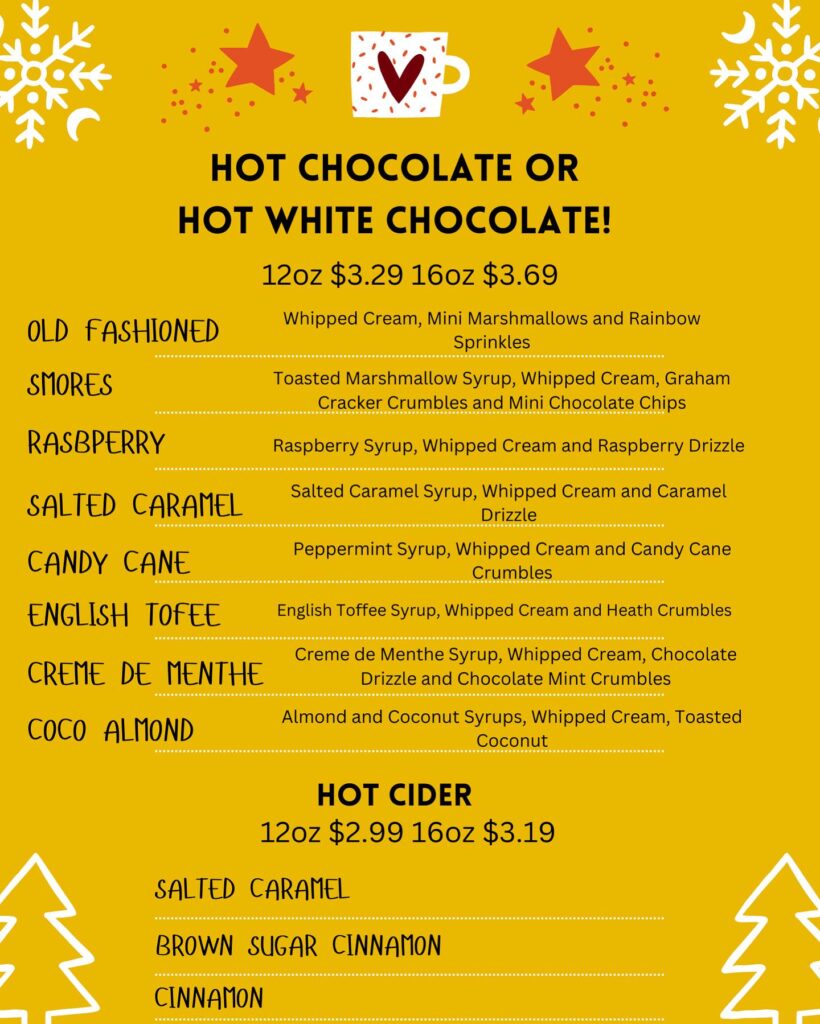 Gourmet hot chocolate and hot cider drinks have returned to the menu at SoDak Soda. The shop also is offering a free treat for Halloween. Drop by in costume Saturday, Monday or Tuesday and get a free mini sugar cookie.