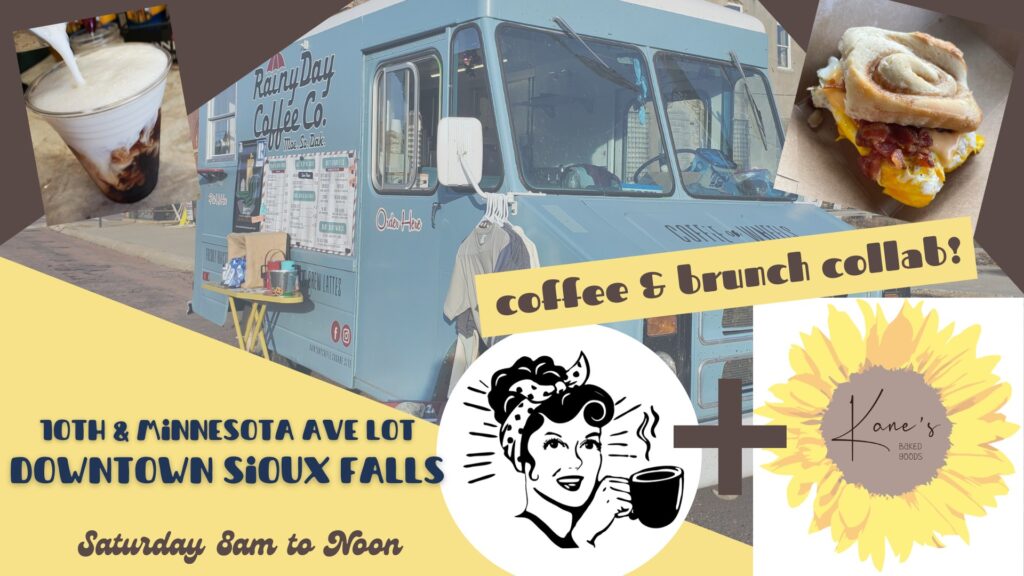 Kane’s Baked Goods & Cafe and Rainy Day Coffee Co. are teaming up again for a breakfast pairing. The two food trucks will be serving from 8 a.m. to noon Saturday in a parking lot at 10th and Minnesota. Kane’s will have its signature cinnamon roll sandwich, loaded breakfast potatoes, breakfast pizza, biscuit and gravy bake and baked goods. Rainy Day has a variety of hot, iced and frozen coffee and tea drinks, along with hot chocolate, cider and smoothies.
