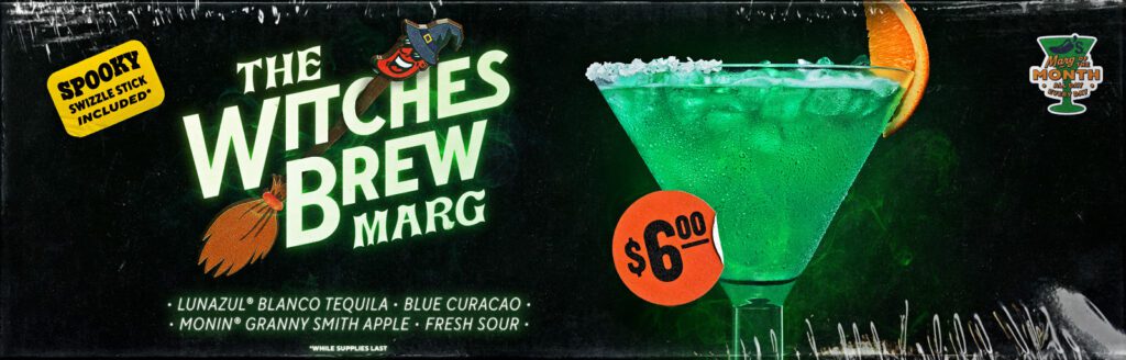 The Marg of the Month at Chili’s Grill & Bar has a spooky vibe for Halloween. The green, Granny Smith apple-flavored The Witches Brew is available for $6.