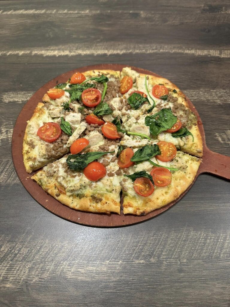 The pizza of the month at Invictus Pizza Kitchen is Perfect Pesto. It has a light garlic butter and basil pesto sauce, mozzarella cheese, grilled chicken, ground beef, cherry tomatoes and spinach.