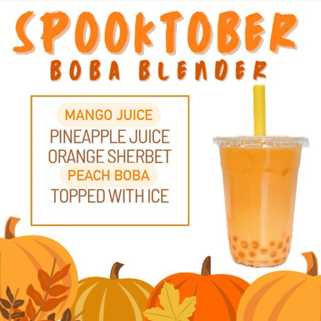 Here’s another drink for the month – this one nonalcoholic – with another vibrant color for Halloween. The Spooktober Boba Blender at Juice Stop features mango and pineapple juices, orange sherbet and peach boba.