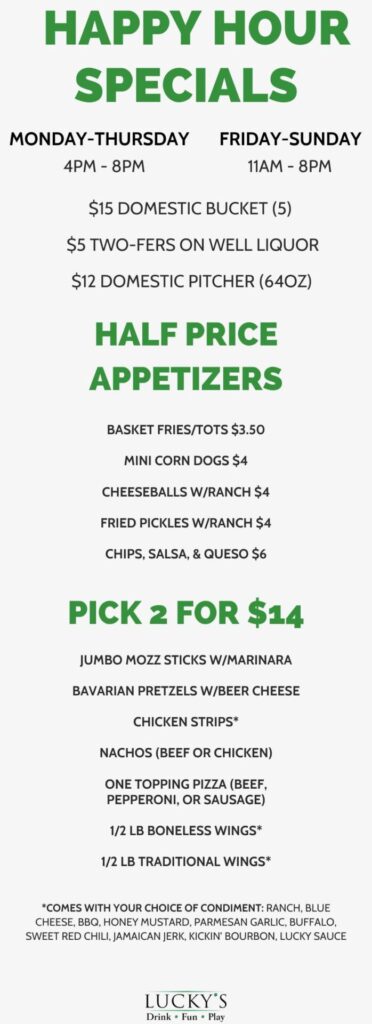 Lucky’s on Louise has new happy hour specials. Hours are 4 to 8 p.m. Monday through Thursday and 11 a.m. to 8 p.m. Friday through Sunday.