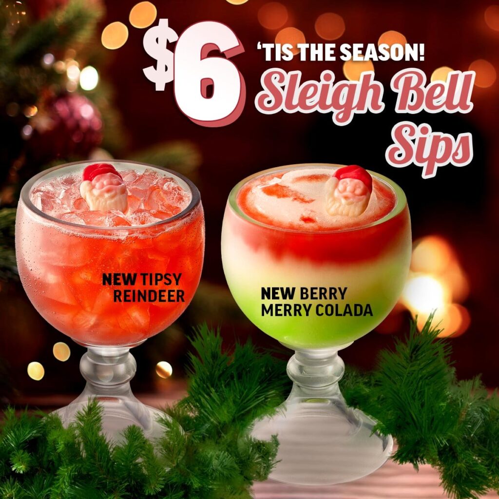 Applebee’s has $6 Sleigh Bell Sips for the season. The Tipsy Reindeer features top-shelf Smirnoff Vodka, cranberry, tropical and citrus flavors. The Berry Merry Colada is a frosty blend of Captain Morgan, melon, coconut and strawberry.