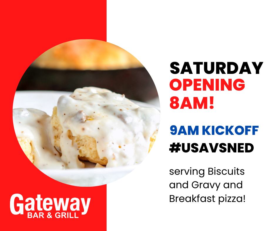 Gateway Bar & Grill will open at 8 a.m. Saturday for the American Outlaws watch party for the next USA team appearance in the World Cup. Special menu items include biscuits and gravy and breakfast pizza. The game starts at 9 a.m.